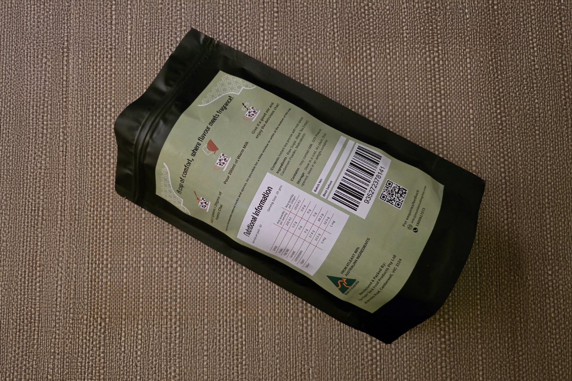Ingredients: Raw Sugar, Black Tea Extract, Cardamom Powder, Maltodextrin.